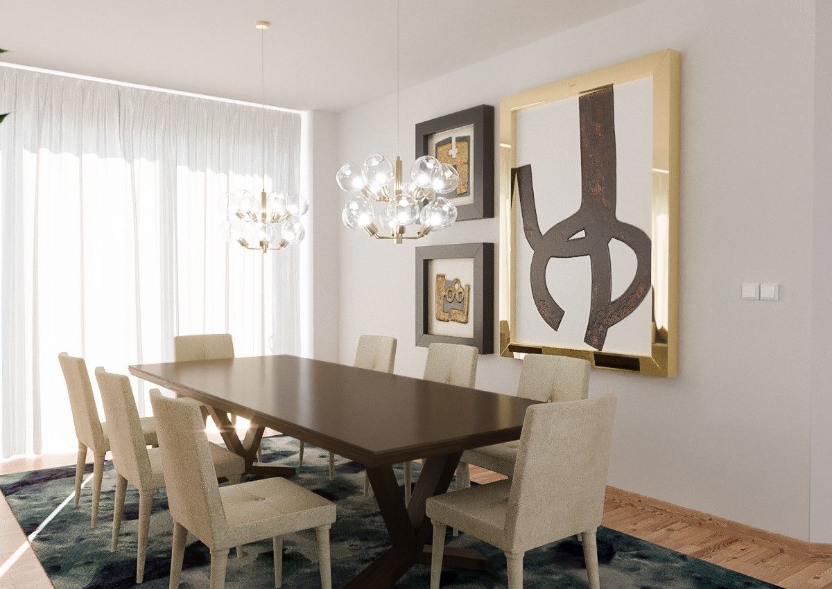 A sala de estar preenchida pelo papel de parede “Curious” converge para uma zona de lounge/leitura composta por poltronas, ao passo que a sala de jantar tem na mesa e nos candeeiros suspensos as suas peças de exceção.