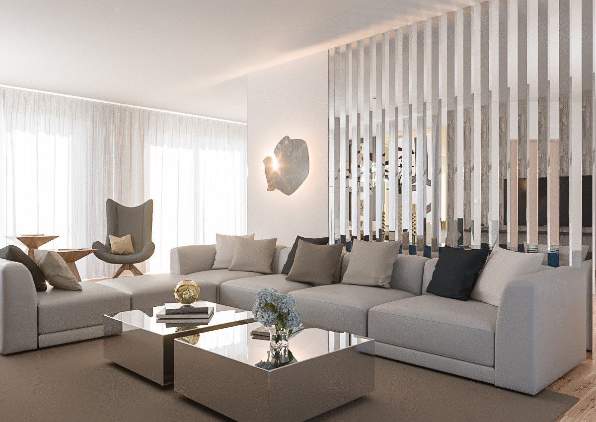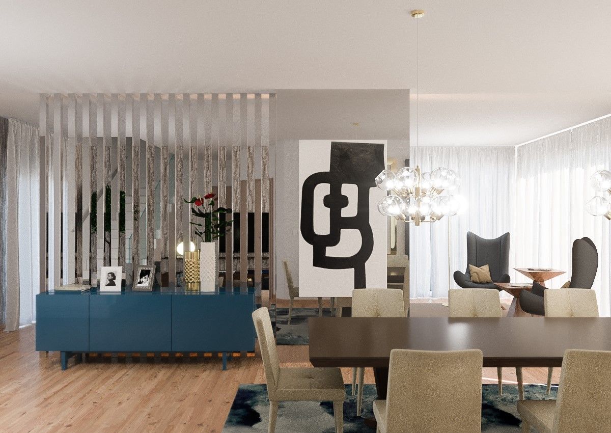 Uma sala de estar e jantar com uma decoração contemporânea requintada e acolhedora, suportada por uma paleta de cores inconvencional entre os azuis e os dourados. A desmaterialização de um pilar construtivo num ripado espelhado confere uma suave divisão visual entre todas as zonas.