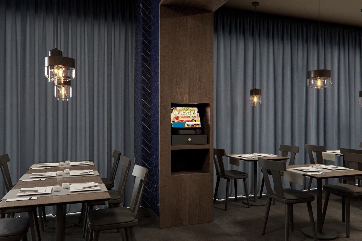 The selection of materials, including dark wood for a cozy atmosphere, and touches of blue and greenery, reflects a balance between sophistication and nature, creating a welcoming atmosphere where cuisine and aesthetics harmoniously come together.