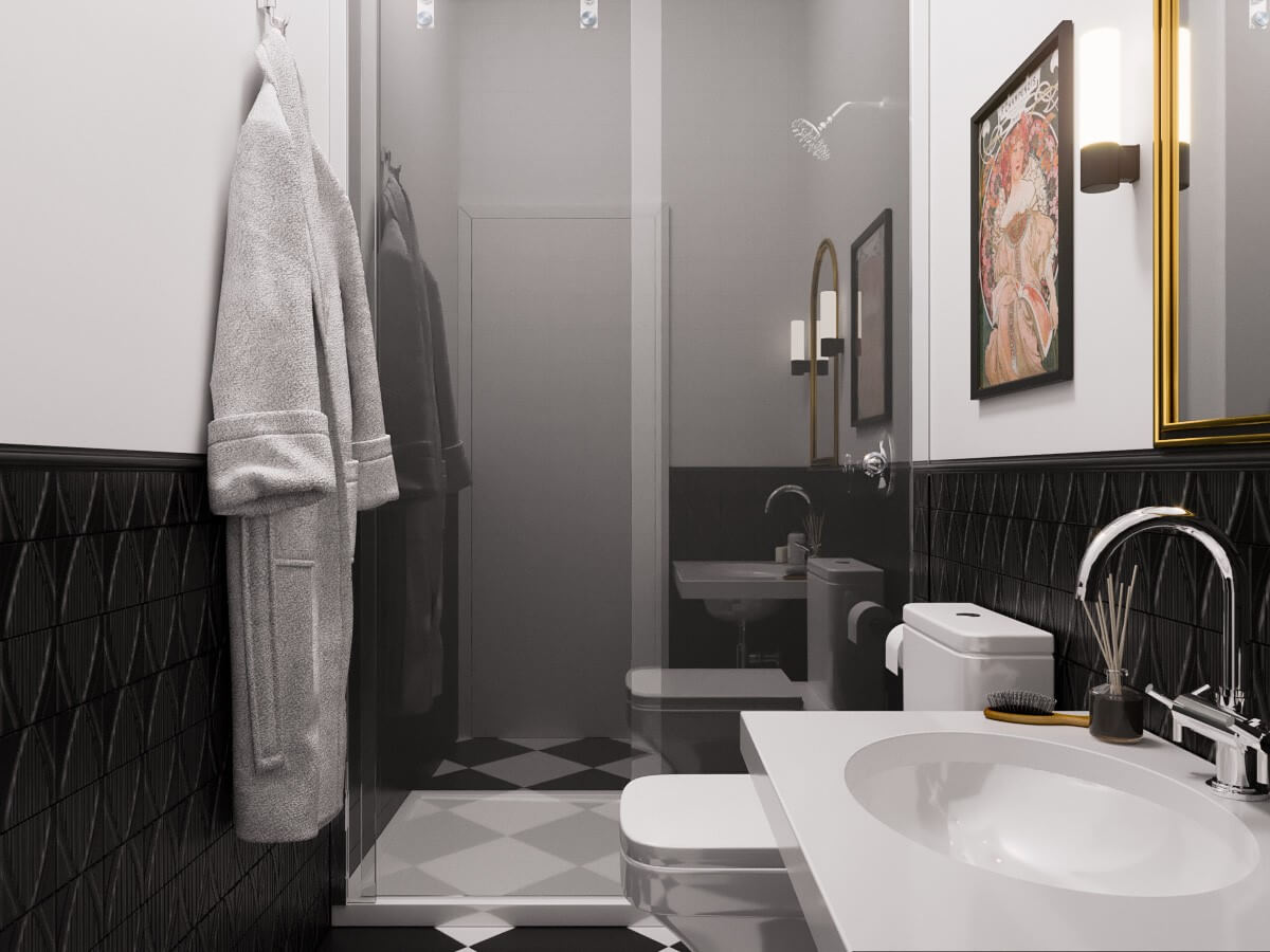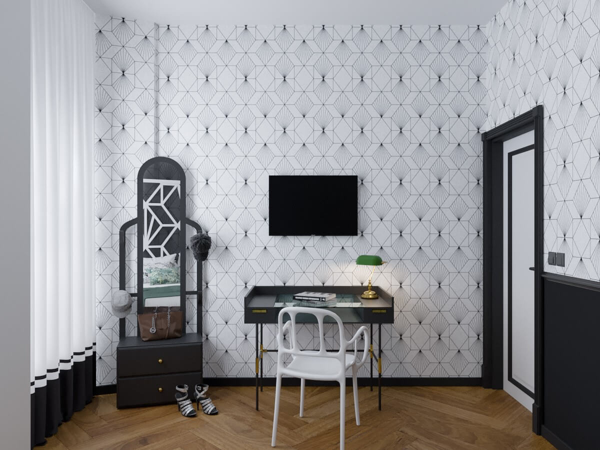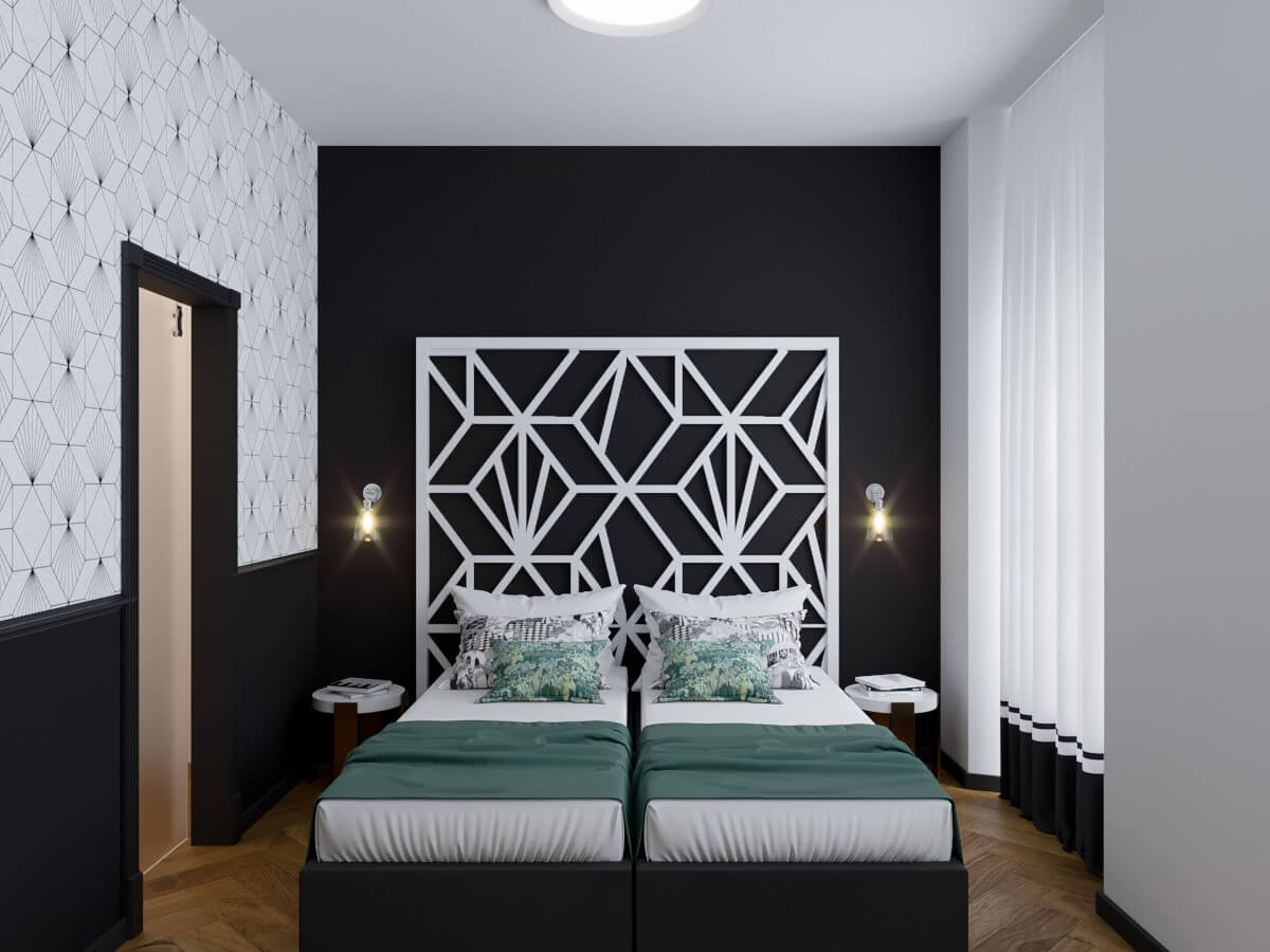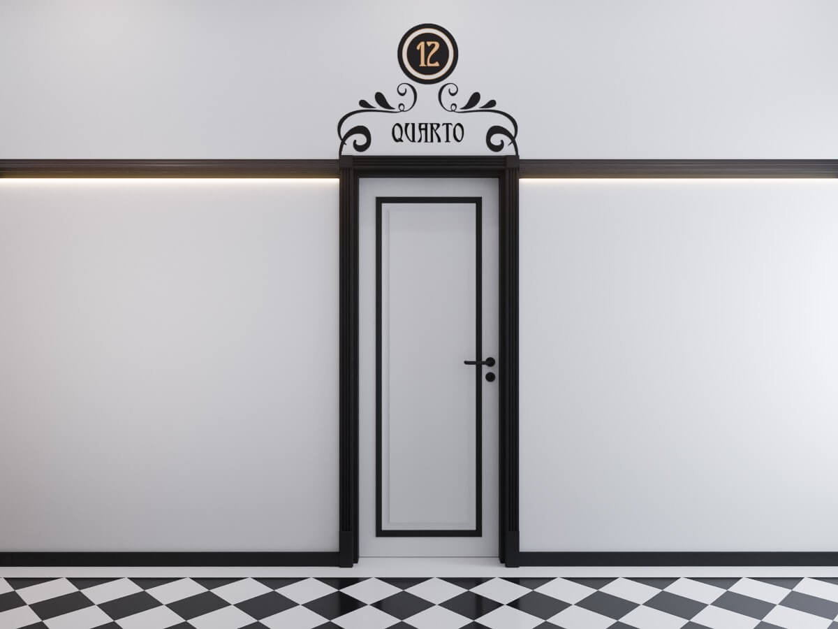"The Twenties Guesthouse" evokes the glamour of the 1920s. The black and white flooring, references to São Bento station, neutral tones, bold geometric details, and stylized lines ensure a typically Art Deco glamorous aesthetic.